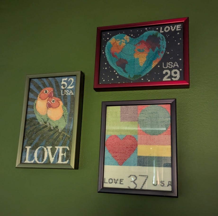 They depict cross stitch in vibrant colors as well as another hobby from my younger years that didn’t survive into adulthood — philately. I still have all my old stamps, but I haven’t added to the collection in a long time. I do enjoy looking at the new stamps that are released each year, though.