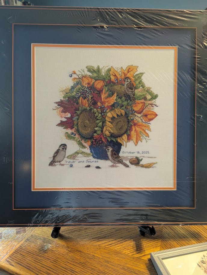 I found this pattern online and knew it was perfect for them because blue is his favorite color, orange is her favorite, she loves sunflowers, they are getting married in the fall, and the birds to me represented the two of them plus any child/ren they may have. I had it framed in their favorite colors, which are also their wedding colors. I told them that every stitch is a hug from me.